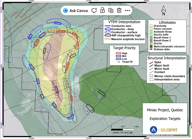 Miniac and Napoleon both host compelling historic gold intercepts drilled by major mining companies. At Napoleon, historic work includes surface samples up to 567 g/t Au and intercepts drilled by Teck Resources such as 79 m @ 0.9 g/t Au. At Miniac, historical and modern drilling has intersected gold-bearing sulphide systems interpreted as distal expressions of a larger VMS-style deposit.